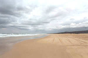 Auf Fraser Island ist der Strand auch der Highway, alles fährt mit seinen allradgetriebenen Boliden, sei es ein Jeep oder ein Bus, auf ihm herum. Obwohl Strand auch etwas übertrieben ist, denn das Baden und Schwimmen wird nicht empfohlen. Unterströmungen, viele kleine Haie und Quallen machen es sehr gefährlich.